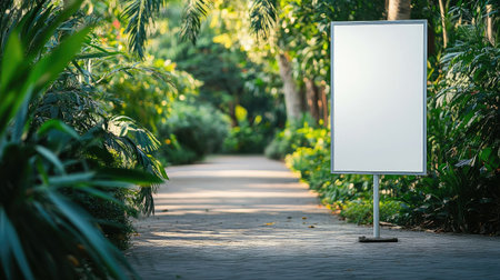 A freestanding white mockup street board placed at the edge of a quiet park pathway with green foliage in the background
