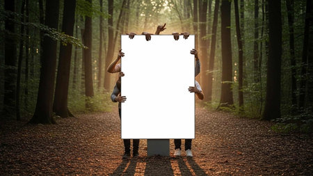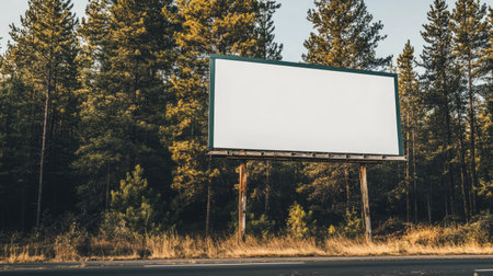 Blank billboard with a white background set against a forested area, surrounded by tall trees. Perfect for nature-themed or environmental messages --chaos