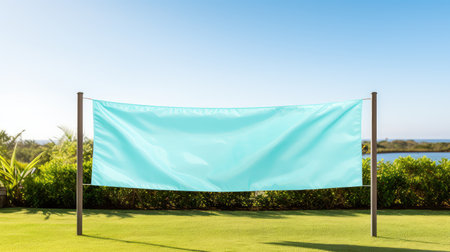 A mockup of a blank white polyester banner hanging from the top of a lamppos. Generative AI