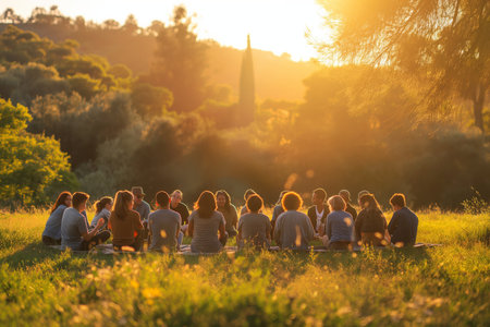 Outdoor, group of students with female teacher sitting on grass