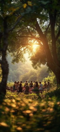 A group of individuals gathered in an outdoor setting, standing in a circle with hands up, happily engaging in recreational activities beneath a tree in the midst of natural surroundings
