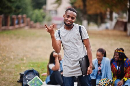 Group of five african college students spending time together on campus at university yard. Black afro friends studying. Education theme.