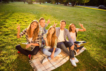 five excited joyful girlfriends and boyfriends together sitting on blanket and showing v-sign