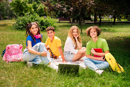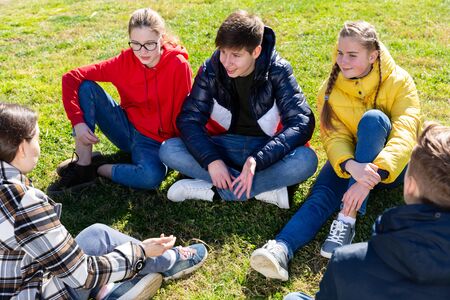 Cheerful teen boys and girls spending time together outdoors on spring day, sitting on green lawn and talking