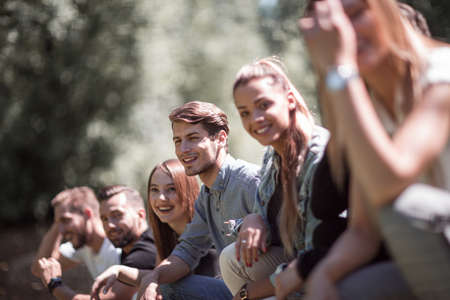 Happy young group of friends hanging out together at the park