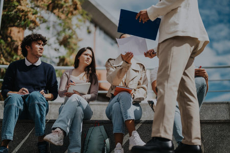 University or high school students sitting outside on the sidewalk, pavement