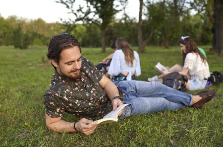 Young guy reading book, getting ready for college exam with his fellow students at park. Friends studying together outdoors. Back to school concept