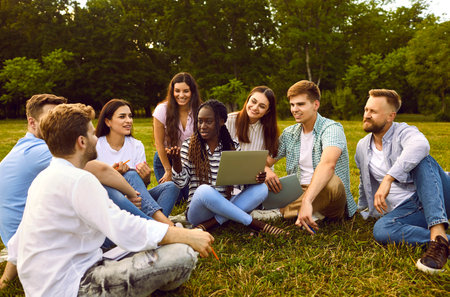 Multiracial group of friends using a laptop and studying while sitting in a park