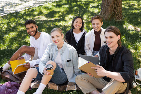High angle view of cheerful multicultural students with copy books and devices sitting on grass in park