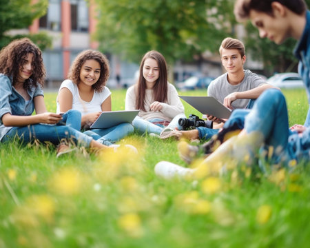 Group of teenagers chatting while sitting on green lawn