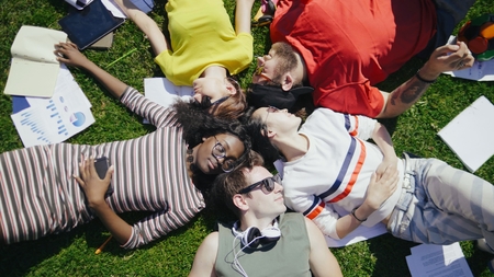 Group of positive handsome young friends or students lying on a green grass head to head