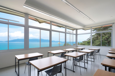 a classroom with a view of the ocean, showcasing the beautiful and serene environment, created with generative ai