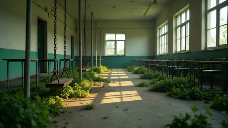 Rows of dusty desks stand silent in a classroom where nature has reclaimed the space. Greenery sprouts through the cracked floor, hinting at the passage of time and the mysteries left behind.