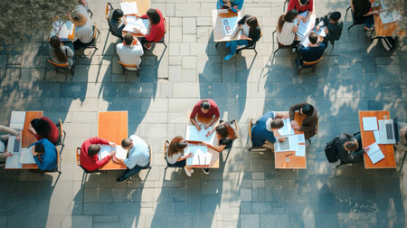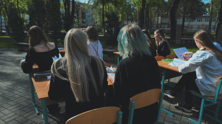 High school students focus on their studies at outdoor desks on a gorgeous sunny day