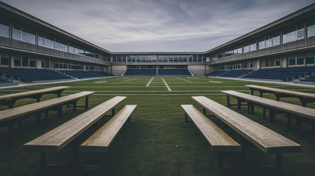 A captivating view of a modern sports facility featuring a well-manicured football field and wooden benches for audience seating under cloudy skies.