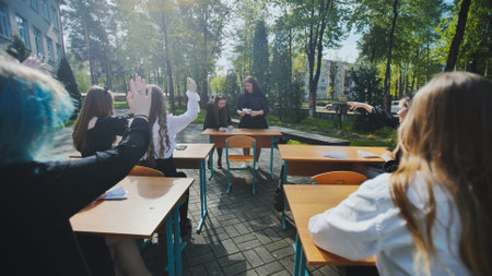 High school students raising hands to answer teachers question during open air lesson in schoolyard