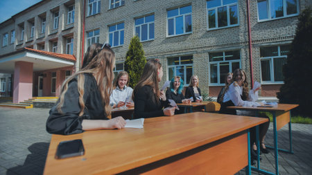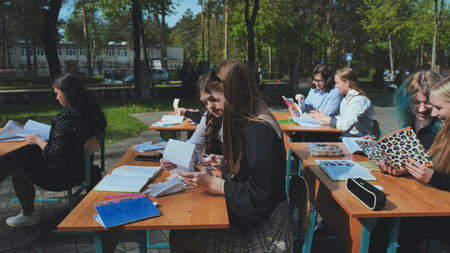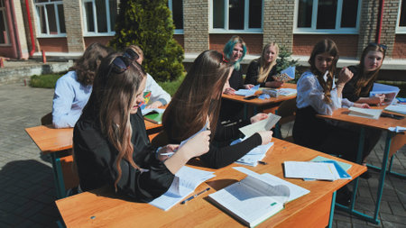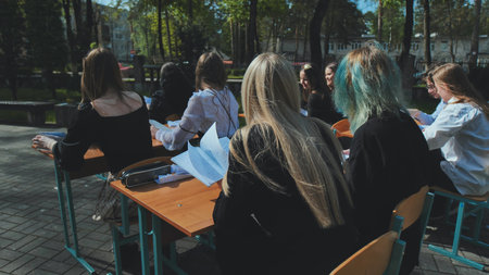 Group of high school students taking exam at desks outdoors in schoolyard on sunny spring or summer day