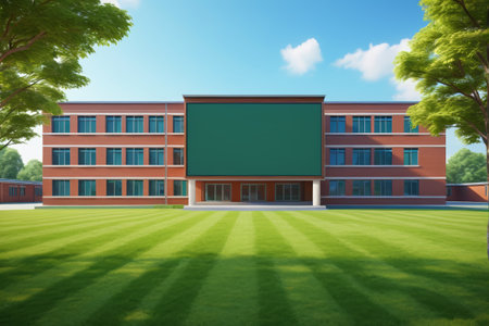 school building with blue sky and white clouds in the background, landscape