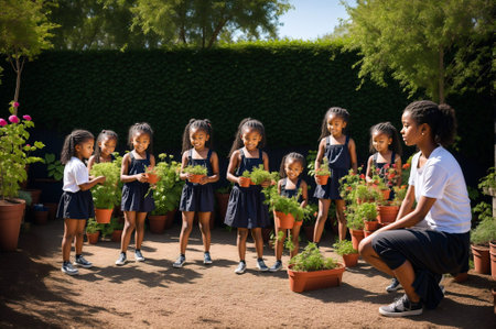 Skilled teacher talking and teaching about environmental sustainable while preparing for planting tree and surrounded with diverse children learning about green clean power. Climate change. AIG42.