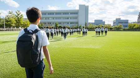 Group of students walking on the field during school hours in a sunny environment
