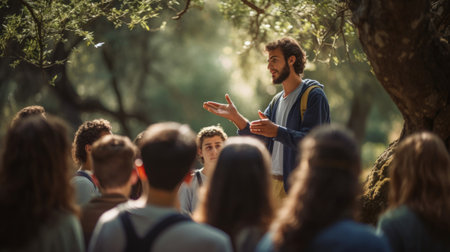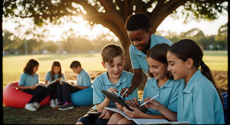A diverse group of students are gathered outdoors, with a presentation screen set up. They are studying and engaged in an educational activity. The composition features various youthful figures dressed casually. The scene is illuminated by bright daylight, suggesting an outdoor environment suitable for educational content.
