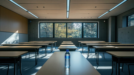 Empty classroom prepared for a seminar, with a water bottle on the desk and a microphone waiting to be used.