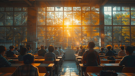 Classroom in background without ,No student or teacher . with Sunset limelight near window.