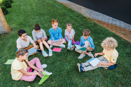 high angle view of group of pupils sitting on grass with books and devices