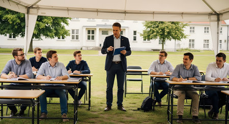 A male teacher conducts a lecture for a group of students seated at desks on a grassy campus lawn. The outdoor setting suggests a university environment focused on open-air learning.