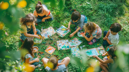 Children deeply immersed in painting their artworks outside, surrounded by the natural beauty of a verdant garden.