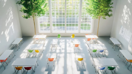 Top view of a classroom with white desks, colorful chairs, and a large window casting natural light, ready for students.