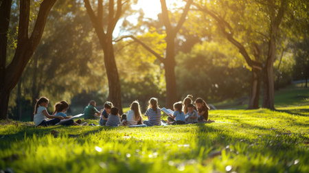 Group of children studying in the park at the day time. Education concept.