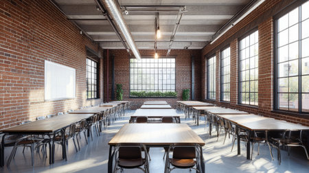 Spacious and inviting classroom with wooden tables and large windows showcasing a bright atmosphere, perfect for educational environments or creative workshops.