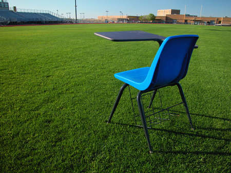 Student Desk on Football Field with School