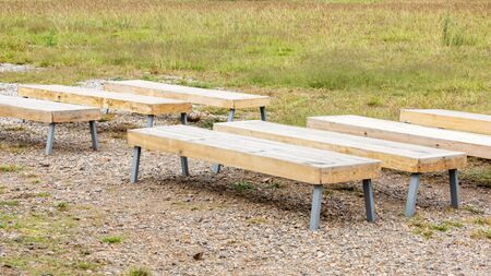 close-up of empty desks in classroom, concept social distancing
