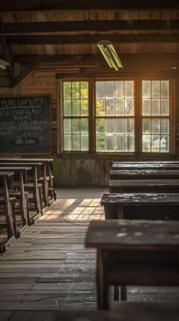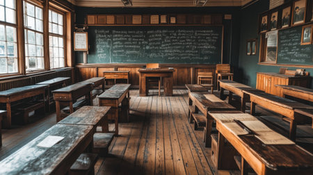 This vintage classroom image captures the essence of traditional learning spaces with wooden desks and a chalkboard, evoking a sense of nostalgia for education.