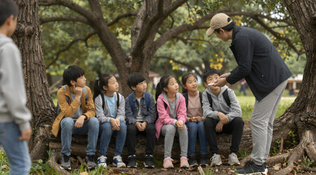 A group of Asian children sitting on a tree in the park.