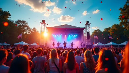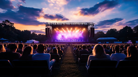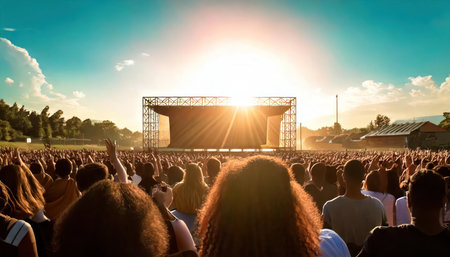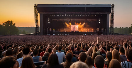 Vibrant scene of a music festival with a large crowd facing a brightly lit stage where a band is playing. The event is set outdoors during the golden hour, creating a festive mood.