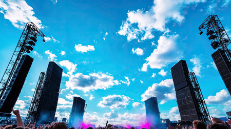 A lively outdoor music festival scene showcases a diverse crowd enjoying a vibrant performance under a beautiful blue sky with fluffy clouds.