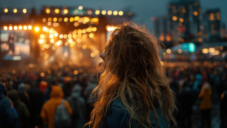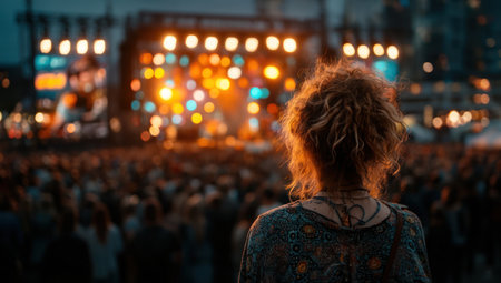 A woman with curly hair is seen from the back, observing a crowd at an outdoor music concert. The scene has a bokeh effect and warm lighting. The stage is in focus with multiple lights in the background. The image could be used for editorial or commercial purposes.