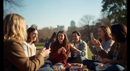 A group of diverse friends enjoying a picnic in a park on a sunny day