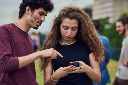 Yes thats how you spell my name. two cheerful young friends browsing on a cellphone together while standing in a park outside during the day.
