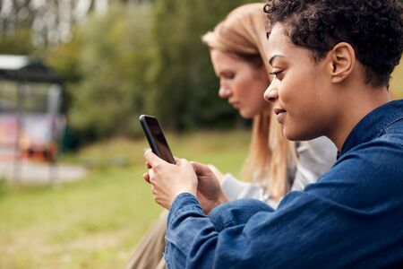 Close-up of two girls using and chatting with their smartphones ar the park.