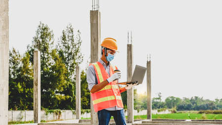 Engineer contractor man use lptop work safety industry project, check house plan design and investigating the size and quality in building construction structures site.