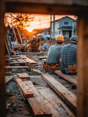 Construction workers building a new house during sunset in a residential area
