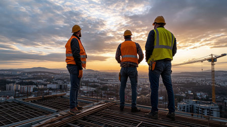 Construction workers at a building site during sunset