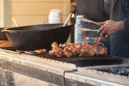 Close-up in a black cast-iron cauldron on the fire boils vegetable oil and pieces of pork ribs are fried. food in nature. Small depth of field.
