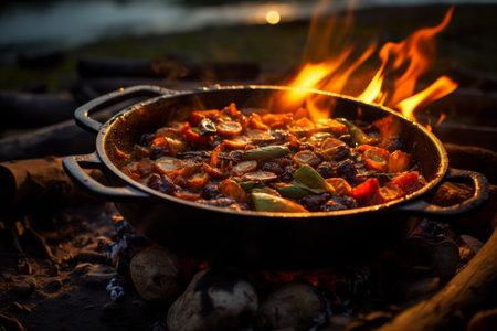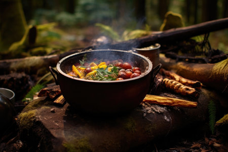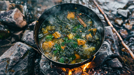 a rustic pot of soup sitting on an outdoor campfire, created with generative ai