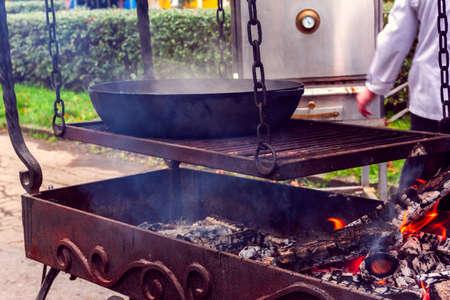 oval bowl from above over a fire for preparation food on a public place