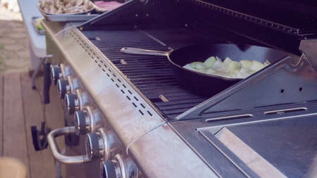 Step by step. Grilled mushrooms and onions in cast iron frying pan on outdoor gas grill.